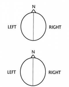 Vòng tròn này (Hình. 4-1) tượng trưng cho đầu người, từ trên cao nhìn xuống. Có chiếc mũi (N). Bộ não con người được chia thành hai phần: Bán cầu não trái và bán cầu não phải.