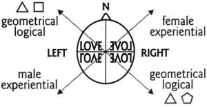 Nhận thức của phụ nữ và nam giới là hình ảnh phản chiếu đối xứng nhau.(Nếu bạn có một tấm gương chắn giữa chúng). Nếu bạn viết một từ LOVE rồi đặt nó vào bán cầu não trái thì bán cầu não phải cũng nhìn thấy hình ảnh phản chiếu của nó trong tấm gương. Khi nam giới nhìn vào cách mà nữ giới nhận thức về điều ấy, anh ta sẽ nói, “Không có một chút tính logic nào ở đây cả”. Còn cô ấy sẽ nhìn anh ta và nói: “Sử dụng cảm xúc đi anh bạn!”