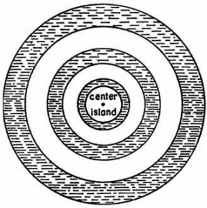 Bước tiếp theo là chiếu lên bề mặt của Atlantis hình dạng Cây sự sống. Họ đã sử dụng hình dạng ở đây (Hình.4-4) với 12 vòng tròn trên đó thay vì 10, nhưng vòng tròn thứ 11 và vòng tròn thứ 12 ở ngoài đất liền; một điểm nằm ở Udal và một điểm ở ngoài mặt nước hướng về phía nam. Vì vậy, có mười điểm nằm trên đất liền, đó là cấu trúc mà chúng ta đã khá quen thuộc. Mặc dù nó kéo dài qua hàng trăm dặm trên bề mặt của vùng đất này nhưng họ chiếu nó với độ chính xác đến từng nguyên tử (Theo như Thoth). Có một dấu hiệu cho thấy rằng ngay cả những quả cầu của Cây sự sống cũng được sử dụng để chỉ kích thước và hình dạng của các thành phố thuộc Atlantis. Plato nói trong cuốn sách Critias của mình rằng thành phố quan trọng nhất của Atlantis được tạo thành từ ba vòng đất ngăn cách bởi nước, như được thể hiện trong bản vẽ này (Hình.4-5). Ông cũng nói rằng thành phố được xây dựng bằng đá đỏ, đen và trắng. Tuyên bố cuối cùng này sẽ cực kỳ có ý nghĩa ngay khi chúng ta nói về Đại Kim Tự Tháp.