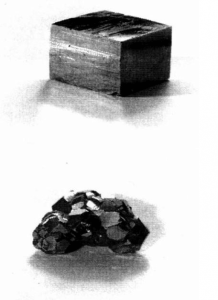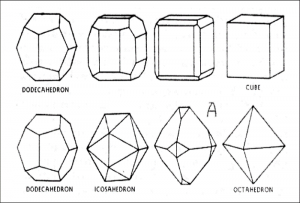 Ở góc trên bên phải của Hình 6-38 là một khối lập phương. Khối lập phương bên trái đã tự nó cắt ngắn dọc theo các cạnh. Bị cắt bớt hai lần nữa, thứ đáng sợ này đã biến thành một khối tứ diện. Đây là một ví dụ về khối lập phương/khối đa diện trong tinh thể.