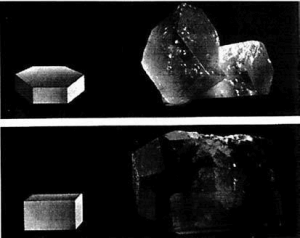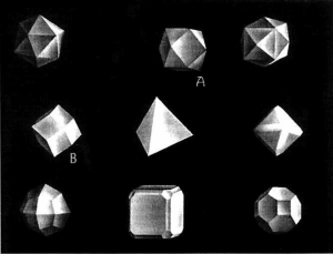 Tại A là khối lập phương mà chúng ta vừa thảo luận; tại B là khối đa diện hình thoi. Cái sau quan trọng vì nó là đối ngẫu của khối lập phương. Nếu bạn nối các tâm của khối lập phương, bạn sẽ có được khối hình thoi và ngược lại. Hình 6-44 cho thấy hình học bên trong của các nguyên tử được phản chiếu như thế nào theo các góc của các tinh thể. Chúng ta đã thấy trước đó, tinh thể ở dạng lập phương, hình bát diện và các dạng khác.