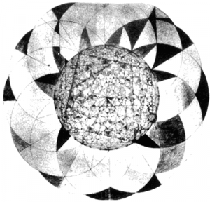 Ratcheting mười hai quả cầu một lần nữa, lần này là 15 độ, có 24 quả cầu và bạn sẽ có được mô hình này (Hình.6-4). Đây được gọi là mô hình siêu việt được liên kết. Mô hình siêu việt là gì? Một con số siêu việt trong toán học, theo cách nhìn của tôi, là một con số đến từ một không gian khác. Trong không gian đó, nó có thể là toàn bộ, nhưng khi tồn tại ở đây, nó không hoàn toàn được dịch nghĩa đầy đủ trong thế giới này. Chúng ta có rất nhiều các con số. Ví dụ, một trong số đó là tỷ lệ phi. Đó là một tỷ lệ toán học bắt nối đầu bằng 1,6180339 và kéo dài mãi mãi, có nghĩa là bạn không bao giờ biết về những gì kế tiếp, các con số sau dòng thập phân sẽ tiếp tục nối dài, và không bao giờ kết thúc. Con người đã để máy vi tính tính toán trong nhiều tháng mà vẫn không tìm thấy điểm kết thúc. Như một giải thích đơn giản, đó là một con số siêu việt.