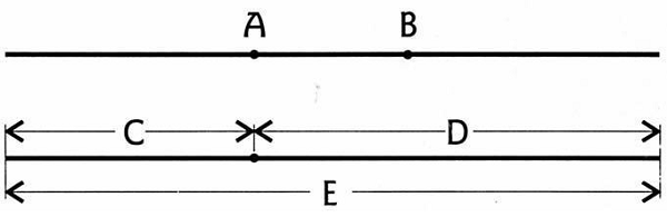 Anh ấy bắt đầu nói với tôi về tỷ lệ phi: 1,618 (làm tròn thành ba dấu thập phân). Tỷ lệ phi là một mối liên hệ rất đơn giản. Nếu bạn có một cái que và bạn sẽ đánh dấu vào vị trí nào đó, chỉ có hai nơi để đánh dấu tỷ lệ phi, được hiển thị như điểm A và B trong hình minh họa (Hình.7-23).